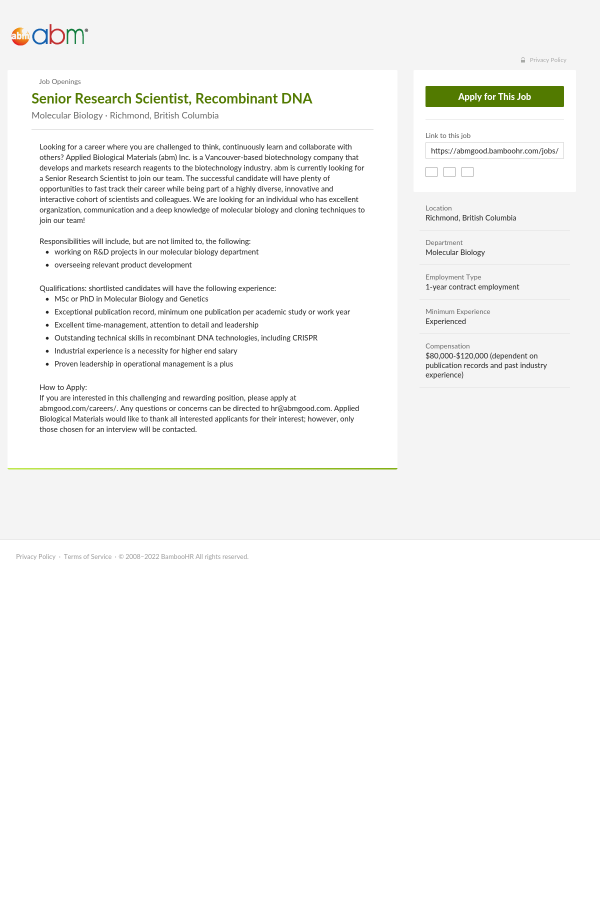 Senior Research Scientist Recombinant Dna Job At Applied Biological Materials In Richmond Canada 57211756 Tapwage Job Search